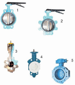 Zwischenflanschausführung (1), Flanschaugenausführung (2), für hohe Temperaturen (3), Gehäuse aus Grauguß, Sphäroguß, Stahlguß, Edelstahl, Aluminium, Messing, PVC, Sitzringe aus EPDM, Perbunan, Viton, PTFE (4) und andere, Sitzringe auswechselbar oder im Gehäuse einvulkanisiert, Klappenscheiben aus Sphäroguß, Messing, Stahl oder Edelstahl, zentriert oder exzentrisch gelagert (5), Betätigung durch Handhebel und Rasterscheibe oder Handgetriebe